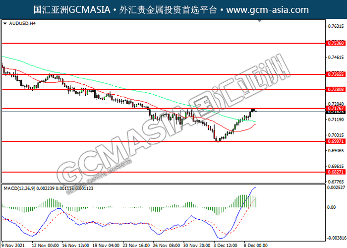 20211209 AUDUSD by willy | Dec 9, 2021 | 澳元兑美元 | 0 comments AUDUSD,H4:澳美震荡上行,目前测试前期压力。然而,MACD多头动能略减,短期可关注技术性回调为主。上方关注0.7175压力和0.7280压力,下方关注0.7000支撑和0.6825支撑。