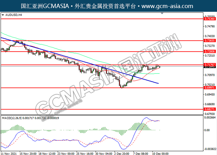 AUDUSD,H4:澳美震荡上行,目前测试前期压力。然而,MACD多头动能略减,短期可关注技术性回调为主。上方关注0.7175压力和0.7280压力,下方关注0.7000支撑和0.6825支撑。