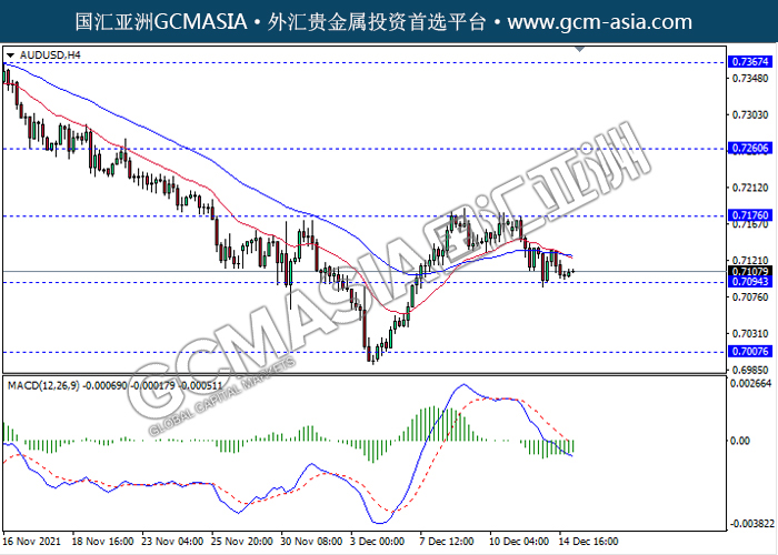 20211215 AUDUSD-午间 by keyk | Dec 15, 2021 | 澳元兑美元 | 0 comments AUDUSD,H4:澳美震荡下行,目前测试靠近前期支撑。MACD动能持续略减,若突破继续看空为主。上方关注0.7175压力和0.7260压力,下方关注0.7095支撑和0.7005支撑。