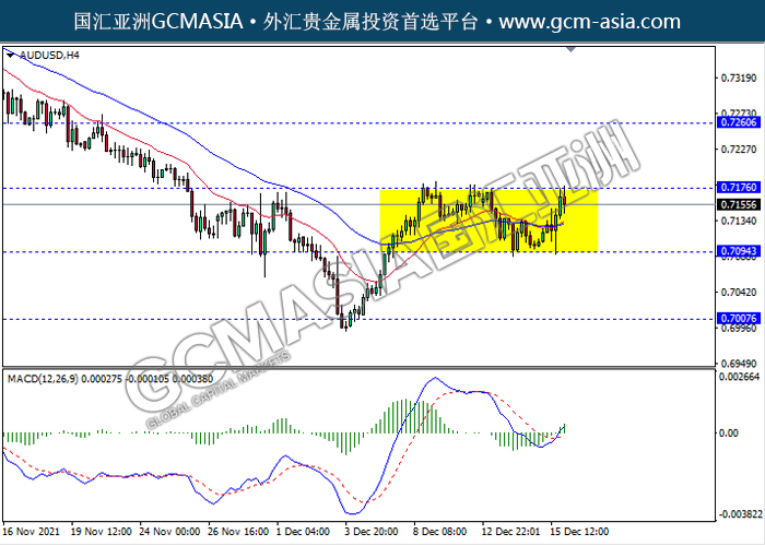 20211216 AUDUSD-午间 by keyk | Dec 16, 2021 | 澳元兑美元 | 0 comments AUDUSD,H4:澳美仍区间震交易,目前测试前期压力。然而,MACD形成金叉,动能略增,若突破可继续看多为主。上方关注0.7175压力和0.7260压力,下方关注0.7095支撑和0.7005支撑。