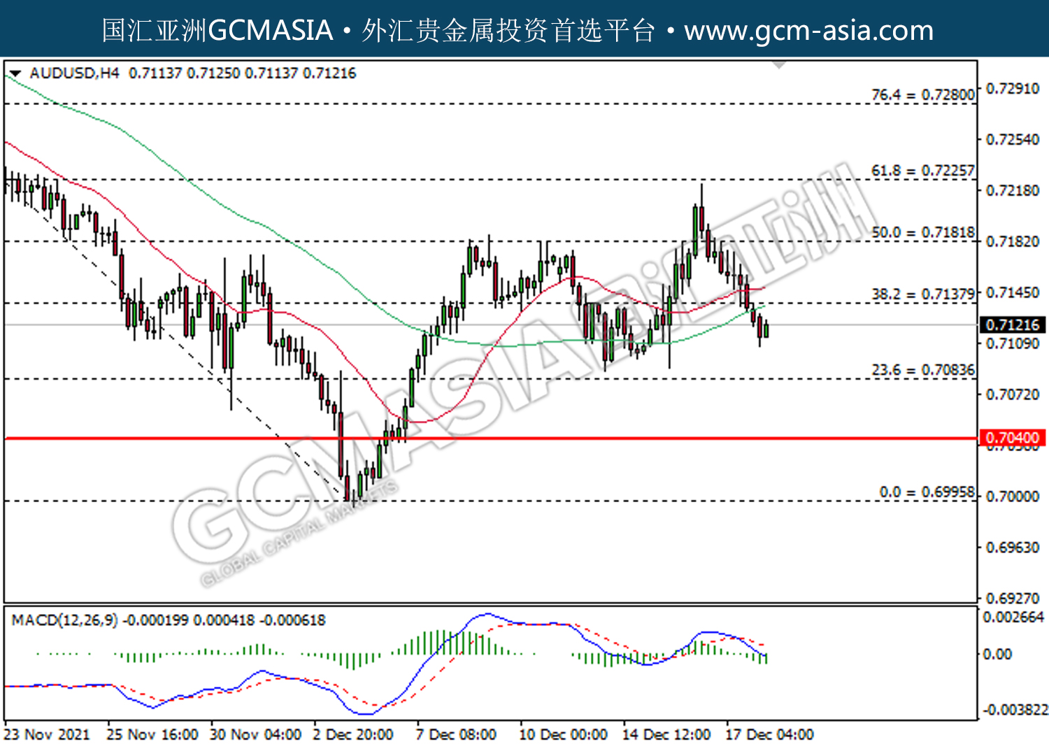 20211220 AUDUSD by willy | Dec 20, 2021 | 澳元兑美元 | 0 comments AUDUSD,H4:澳美高位承压回落。MACD已形成死叉,动能转弱,短期关注空头为主。上方关注0.7140压力和0.7180压力,下方关注0.7085支撑和0.7040支撑。