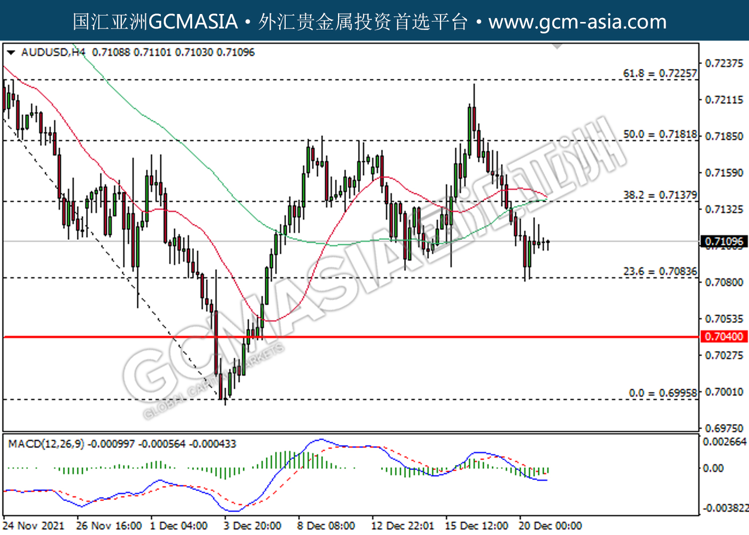 20211221 AUDUSD by willy | Dec 21, 2021 | 澳元兑美元 | 0 comments AUDUSD,H4:澳美低位反弹。MACD空头动能有所略减,短期关注多头为主。上方关注0.7140压力和0.7180压力,下方关注0.7085支撑和0.7040支撑。
