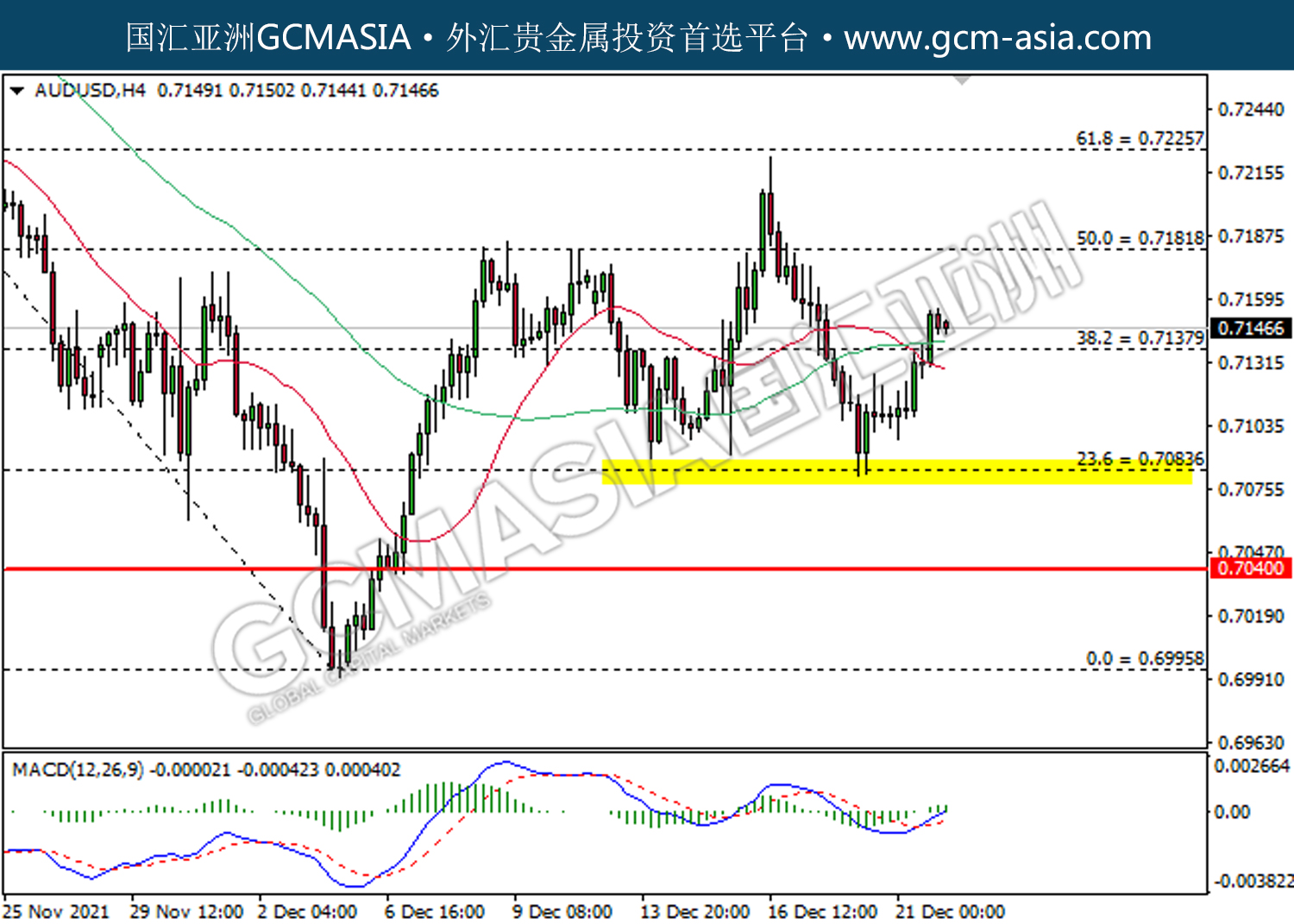 20211222 AUDUSD by willy | Dec 22, 2021 | 澳元兑美元 | 0 comments AUDUSD,H4:澳美低位反弹。MACD多头动能有所略增,短期关注多头势力为主。上方关注0.7180压力和0.7225压力,下方关注0.7140支撑和0.7085支撑。
