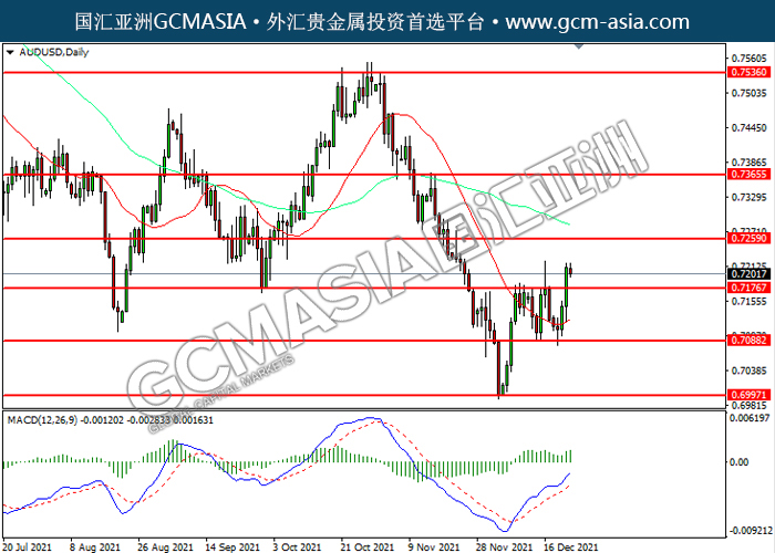 20211223 AUDUSD-午间 by willy | Dec 23, 2021 | 澳元兑美元 | 0 comments AUDUSD,Daily:澳美突破前期压力,震荡上行。MACD多头动能略增,短期可关注多头为主。上方关注0.7260压力和0.7365压力,下方关注0.7175支撑和0.7090支撑。