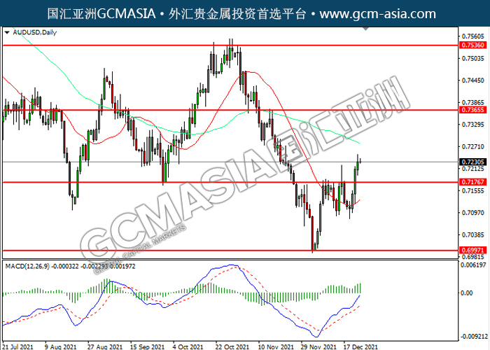 20211224 AUDUSD-午间 by willy | Dec 24, 2021 | 澳元兑美元 | 0 comments AUDUSD,Daily:澳美突破前期压力,震荡上行。MACD多头动能略增,短期可关注多头为主。上方关注0.7365压力和0.7535压力,下方关注0.7175支撑和0.6995支撑。