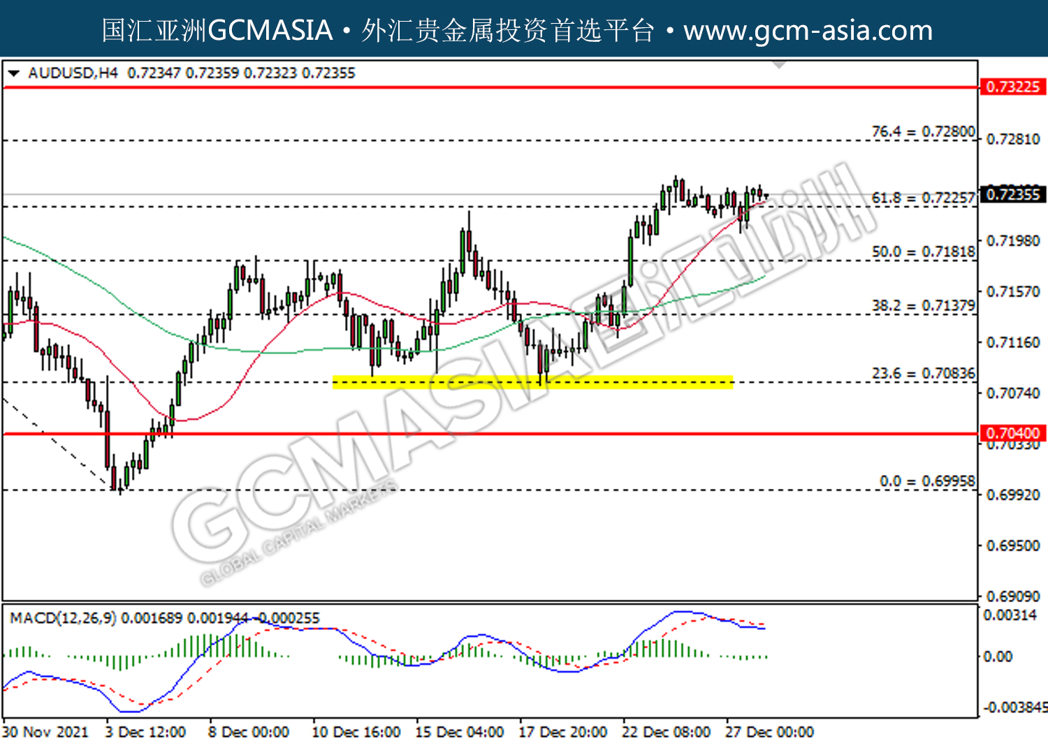 20211228 AUDUSD by willy | Dec 28, 2021 | 澳元兑美元 | 0 comments AUDUSD,H4:澳美高位承压回落。MACD已形成死叉,动能偏弱,短期关注空头为主。上方关注0.7280压力和0.7320压力,下方关注0.7225支撑和0.7180支撑。