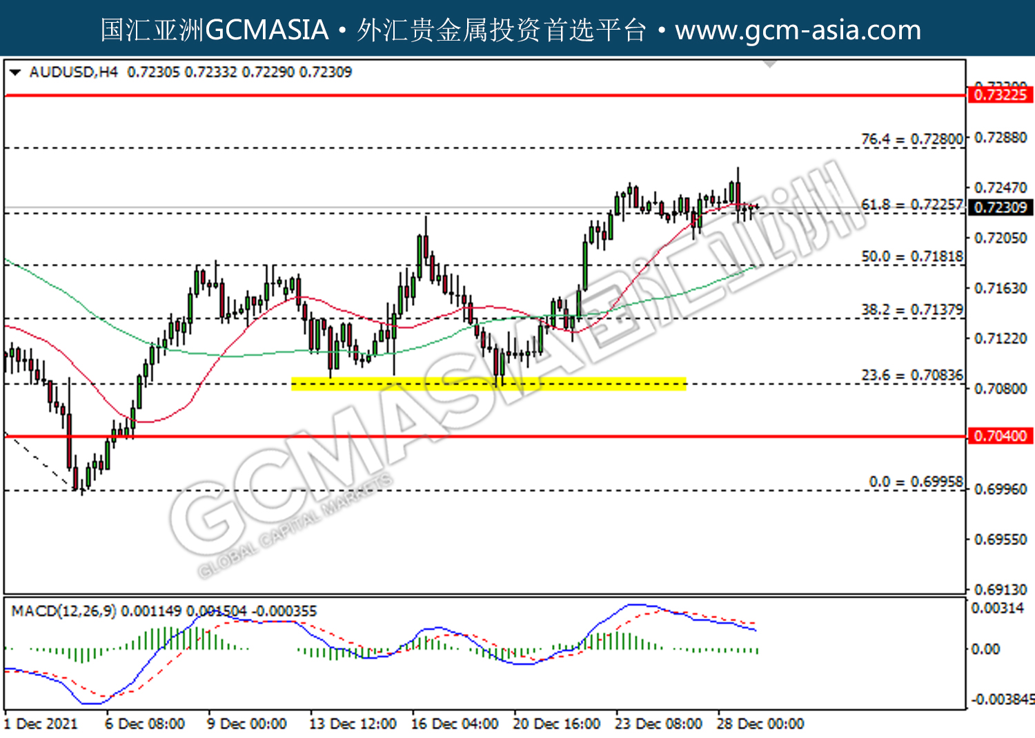 20211229 AUDUSD by willy | Dec 29, 2021 | 澳元兑美元 | 0 comments AUDUSD,H4:澳美高位承压回落。MACD已形成死叉,动能偏弱,短期关注空头为主。上方关注0.7280压力和0.7320压力,下方关注0.7225支撑和0.7180支撑。