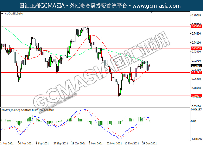20220105 AUDUSD-午间 by willy | Jan 5, 2022 | 澳元兑美元 | 0 comments AUDUSD,Daily:澳美高位回落,目前测试前期支撑。MACD多头动能略减,若下破可关注空头为主。上方关注0.7365压力和0.7535压力,下方关注0.7175支撑和0.6995支撑。