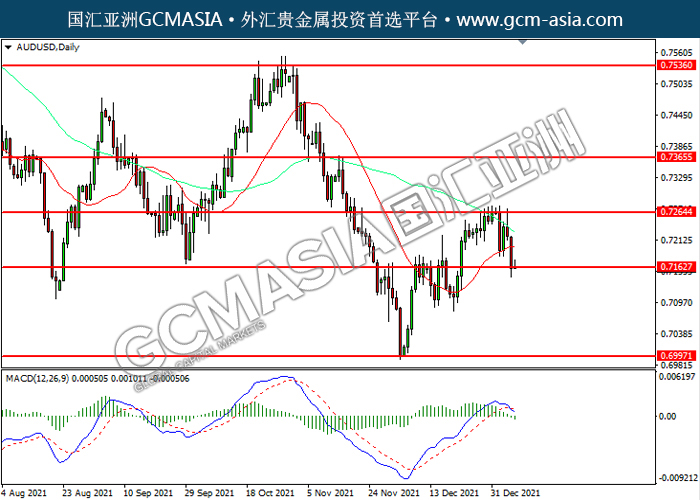 20220107 AUDUSD-午间 by willy | Jan 7, 2022 | 澳元兑美元 | 0 comments AUDUSD,Daily:澳美高位回落,目前测试前期支撑。MACD已形成死叉,动能转弱,若下破可关注空头为主。上方关注0.7265压力和0.7365压力,下方关注0.7165支撑和0.6995支撑。