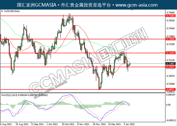20220110 AUDUSD-午间 by willy | Jan 10, 2022 | 澳元兑美元 | 0 comments AUDUSD,Daily:澳美高位回落,目前测试前期支撑。MACD已形成死叉,动能转弱,若下破可关注空头为主。上方关注0.7265压力和0.7365压力,下方关注0.7165支撑和0.6995支撑。