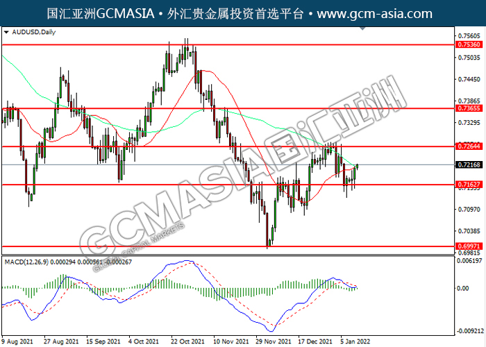 20220112 AUDUSD-午间 by willy | Jan 12, 2022 | 澳元兑美元 | 0 comments AUDUSD,Daily:澳美低位反弹。MACD空头动能略减,短期可关注多头为主。上方关注0.7265压力和0.7365压力,下方关注0.7165支撑和0.6995支撑。