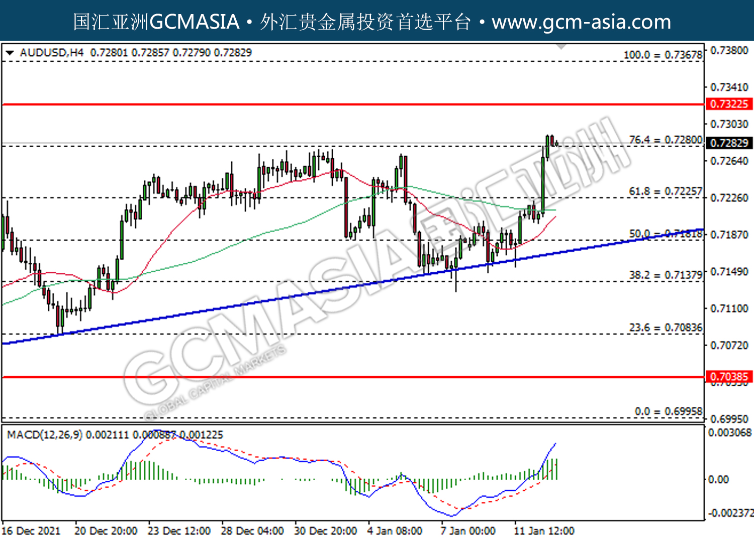 20220113 AUDUSD by willy | Jan 13, 2022 | 澳元兑美元 | 0 comments AUDUSD,H4:澳美低位反弹。MACD已形成金叉,动能偏强,短期关注多头势力为主。上方关注0.7320压力和0.7370压力,下方关注0.7280支撑和0.7225支撑。