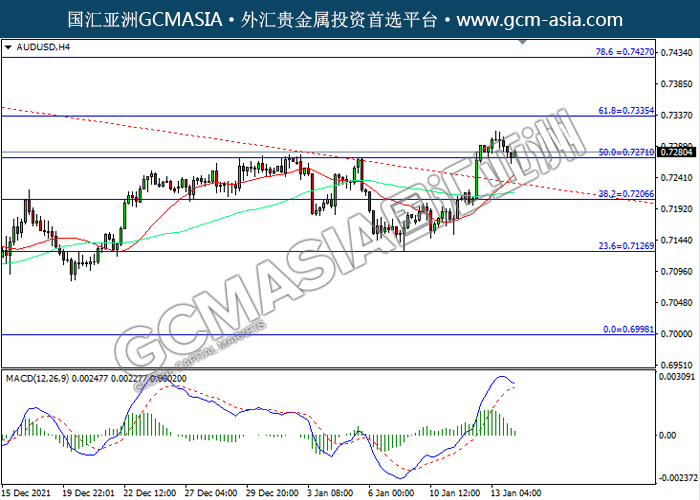 20220114 AUDUSD-午间 by willy | Jan 14, 2022 | 澳元兑美元 | 0 comments AUDUSD,H4:澳美震荡下行,目前测试前期支撑。MACD多头动能略减,若下破可关注空头为主。上方关注0.7335压力和0.7425压力,下方关注0.7270支撑和0.7205支撑。