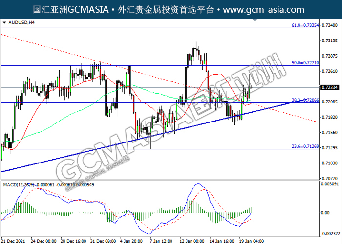 AUDUSD,H4:澳美下破前期支撑,震荡下行。然而,MACD空头动能略减,短期可关注技术性回调为主。上方关注0.7205压力和0.7270压力,下方关注0.7125支撑和0.7000支撑。