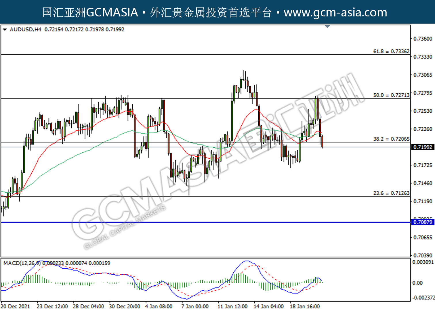 20220121 AUDUSD by willy | Jan 21, 2022 | 澳元兑美元 | 0 comments AUDUSD,H4:澳美高位承压回落。MACD多头动能有所略减,若下破可继续看空。上方关注0.7270压力和0.7335压力,下方关注0.7210支撑和0.7125支撑。