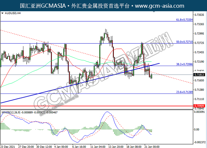 20220124 AUDUSD by willy | Jan 24, 2022 | 澳元兑美元 | 0 comments AUDUSD,H4:澳美下破前期支撑,震荡下行。MACD空头动能略增,短期可关注空头为主。上方关注0.7205压力和0.7270压力,下方关注0.7125支撑和0.7090支撑。