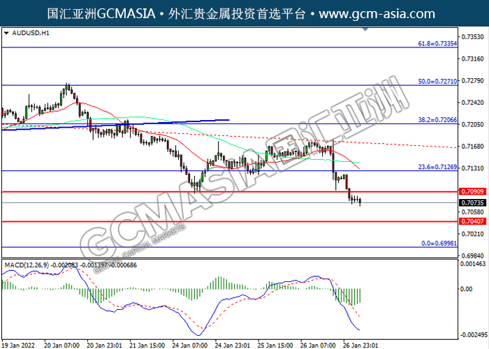 20220127 AUDUSD-午间 by willy | Jan 27, 2022 | 澳元兑美元 | 0 comments AUDUSD,H1:澳美下破前期支撑,持续下行。然而,MACD空头动能略减,短期可关注技术性回调为主。上方关注0.7090压力和0.7125压力,下方关注0.7040支撑和0.7000支撑。