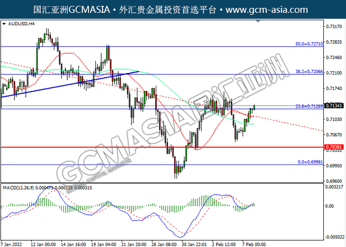 20220208 AUDUSD-午间 by willy | Feb 8, 2022 | 澳元兑美元 | 0 comments AUDUSD,H4:澳美突破前期压力,持续上行。MACD多头动能略增,短期可关注多头为主。上方关注0.7205压力和0.7270压力,下方关注0.7125支撑和0.7040支撑。