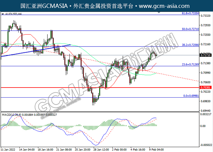 20220210 AUDUSD-午间 by willy | Feb 10, 2022 | 澳元兑美元 | 0 comments AUDUSD,H4:澳美突破前期压力,持续上行。然而,MACD多头动能略减,短期可关注技术性回调为主。上方关注0.7205压力和0.7270压力,下方关注0.7125支撑和0.7040支撑。