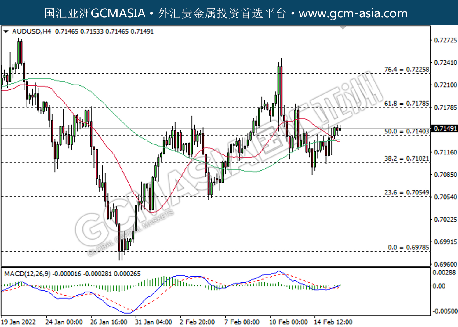 20220216 AUDUSD by willy | Feb 16, 2022 | 澳元兑美元 | 0 comments AUDUSD,H4:澳美低位反弹。MACD已形成金叉,动能转强,短期关注多头势力。上方关注0.7180压力和0.7225压力,下方关注0.7140支撑和0.7100支撑。