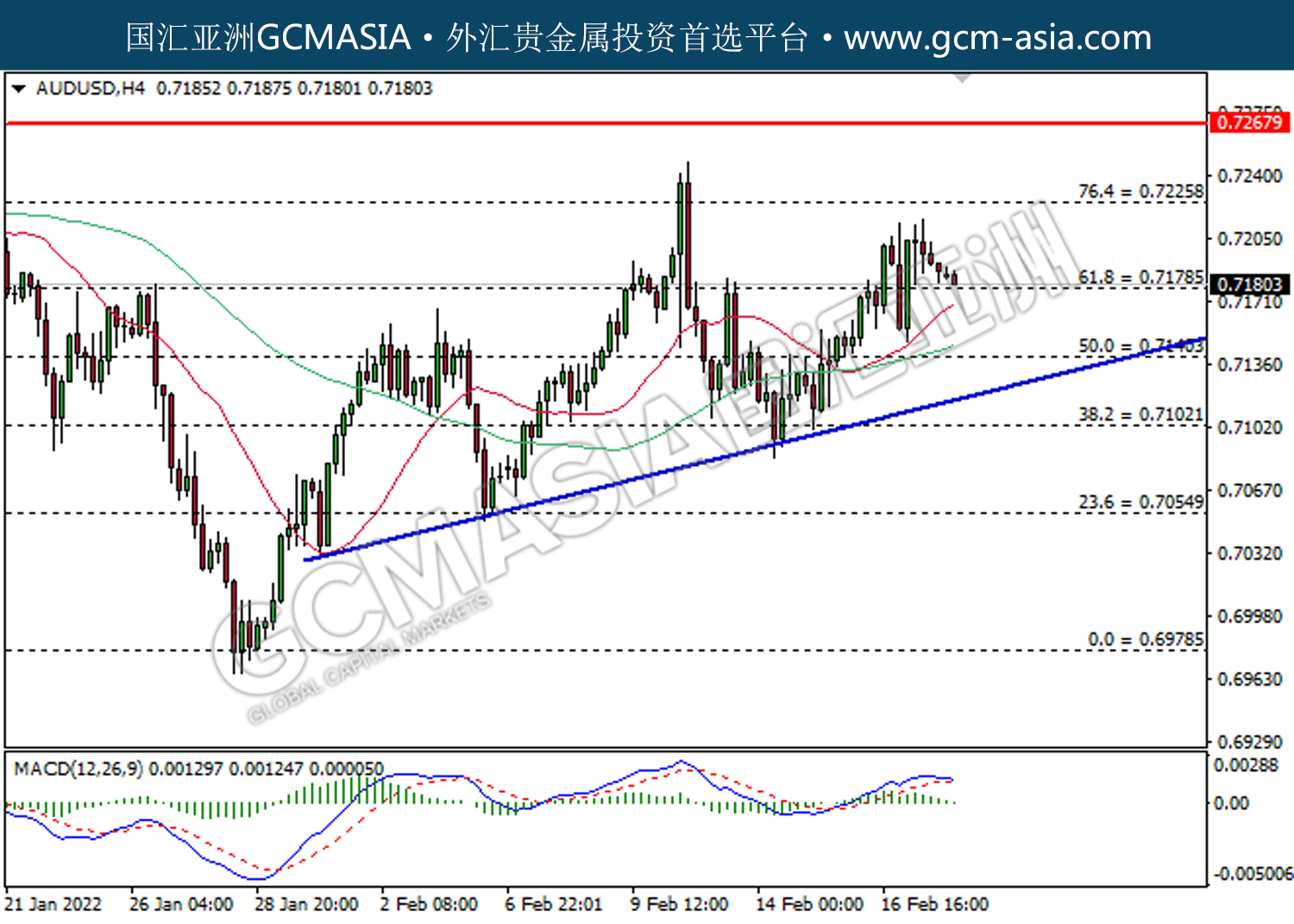 20220218 AUDUSD by willy | Feb 18, 2022 | 澳元兑美元 | 0 comments AUDUSD,H4:澳美受承压回落。MACD多头动能有所略减,短期关注空头势力。上方关注0.7225压力和0.7270压力,下方关注0.7180支撑和0.7140支撑。