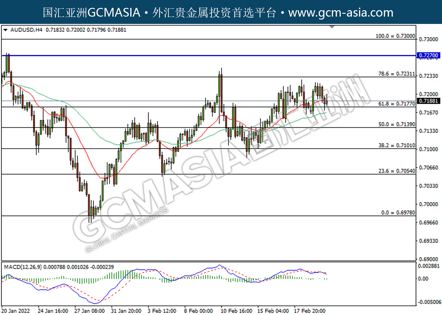 2022022 AUDUSD by willy | Feb 22, 2022 | 澳元兑美元 | 0 comments AUDUSD,H4:澳美受承压回落。MACD已形成死叉,动能转弱,短期关注空头为主。上方关注0.7230压力和0.7270压力,下方关注0.7180支撑和0.7140支撑。