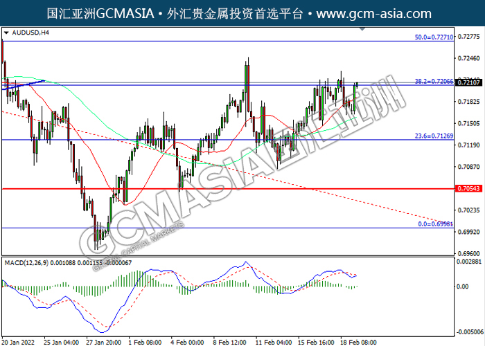 20220221 AUDUSD-午间 by willy | Feb 21, 2022 | 澳元兑美元 | 0 comments AUDUSD,H4:澳美震荡上行,目前测试前期压力。MACD空头动能略减,若突破可关注多头为主。上方关注0.7205压力和0.7270压力,下方关注0.7125支撑和0.7055支撑。