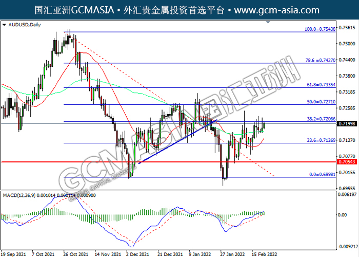 20220222 AUDUSD-午间 by willy | Feb 22, 2022 | 澳元兑美元 | 0 comments AUDUSD,Daily:澳美震荡上行,目前测试前期压力。MACD空头动能略减,若突破可关注多头为主。上方关注0.7205压力和0.7270压力,下方关注0.7125支撑和0.7055支撑。
