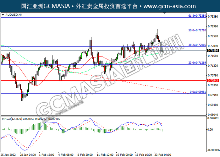 20220224 AUDUSD-午间 by willy | Feb 24, 2022 | 澳元兑美元 | 0 comments AUDUSD,H4:澳美下破前期支撑,持续下行。MACD空头动能略增,短期可关注空头为主。上方关注0.7205压力和0.7270压力,下方关注0.7125支撑和0.7055支撑。