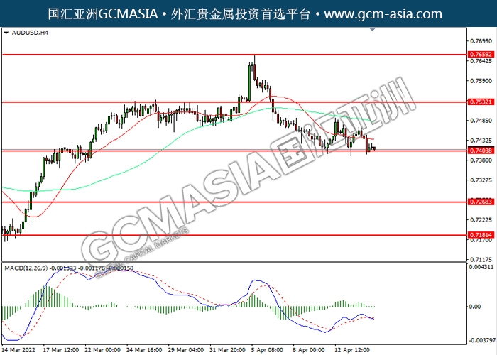 AUDUSD,H4:澳美高位回落,目前测试前期支撑。MACD空头动能有所略增,若下破关注空头为主。上方关注0.7530压力和0.7660压力,下方关注0.7405支撑和0.7270支撑。