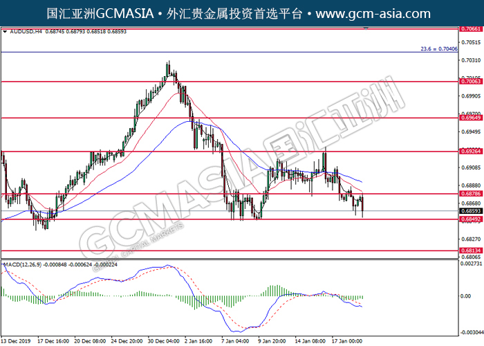 AUDUSD,H4:澳美高位承压后回落。然而,MACD转向多头,动能略增,短期可关注技术新上调。上方关注0.6880压力和0.6925压力,下方关注0.6850支撑和0.6815支撑。
