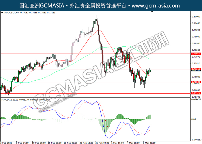 AUDUSD,H4:澳美震荡上行,目前测试前期压力。MACD多头动能略增,若突破可关注多头为主。上方关注0.7720压力和0.7800压力,下方关注0.7650支撑和0.7590支撑。