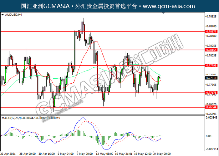 AUDUSD,H4:澳美低位反弹。MACD多头动能略增,短期可关注多头为主。上方关注0.7780压力和0.7815压力,下方关注0.7715支撑和0.7685支撑。