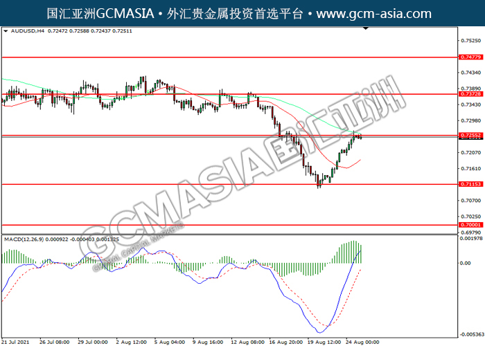20210825 AUDUSD by willy | Aug 25, 2021 | 澳元兑美元 | 0 comments AUDUSD,H4:澳美震荡下行,目前测试前期支撑。然而,MACD多头动能略减,短期可关注技术性回调为主。上方关注0.7255压力和0.7375压力,下方关注0.7115支撑和0.7000支撑。