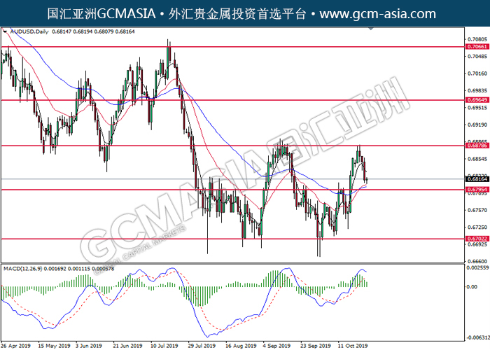 251019 AUDUSD-午间 by keyk | Oct 25, 2019 | 澳元兑美元 | 0 comments GCMAsia - AUDUSD AUDUSD 2019-10-25 AUDUSD,Daily:澳美空头排列。MACD动能持续略减,中期可继续看空为主。上方关注0.6880压力和0.6965压力,下方关注0.6795支撑和0.6700支撑。