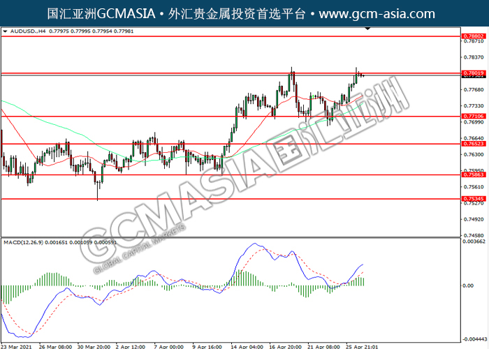 AUDUSD,H4:澳美震荡上行,目前测试前期亚拉。MACD多头动能略增,若突破可关注多头为主。上方关注0.7800压力和0.7880压力,下方关注0.7710支撑和0.7660支撑。