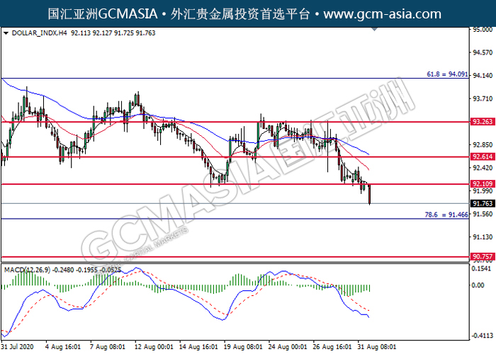 20200901 DOLLAR_INDX-午间 by willy | Sep 1, 2020 | 美元指数 | 0 comments GCMAsia-DOLLAR_INDX DOLLAR_INDX 2020-09-01 DOLLAR_INDX,H4:美指突破后持续下行。MACD空头动能偏强,短期可关注空头为主。上方关92.10压力和92.60压力,下方关注91.45支撑和90.75支撑。