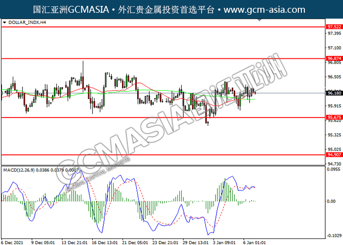 070122 DOLLAR_INDX-午间 by willy | Jan 7, 2022 | 美元指数 | 0 comments DOLLAR_INDX,H4:美指低位反弹。MACD多头动能略减,短期可关注技术性回调为主。上方关96.85压力和97.50压力,下方关注95.65支撑和94.90支撑。