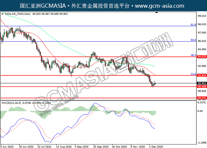 DOLLAR_INDX,Daily:美指震荡下行,目前测试前期支撑。然而,MACD空头动能略减,短期可关注技术性回调为主。上方关91.80压力和94.05压力,下方关注90.45支撑和89.10支撑。