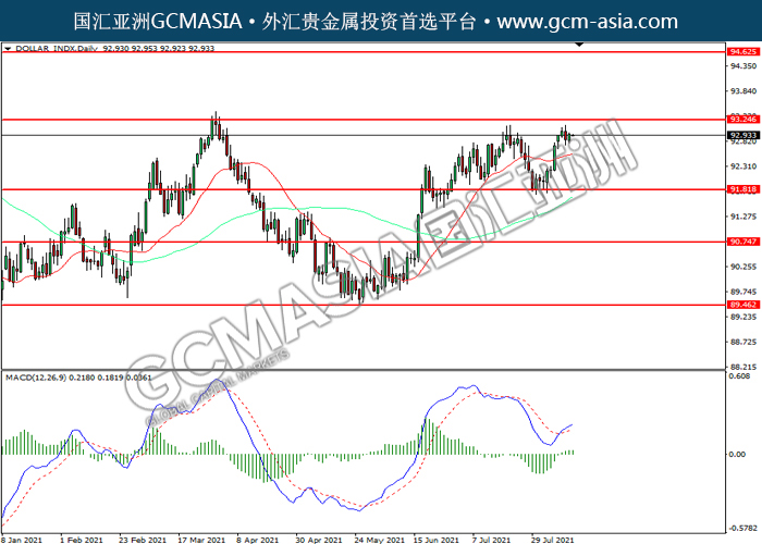 20210813 DOLLAR_INDX by willy | Aug 13, 2021 | 美元指数 | 0 comments DOLLAR_INDX,Daily:美指低位反弹。MACD空头动能略减,短期可关注多头为主。上方关92.25力和92.65压力,下方关注91.80支撑和90.75支撑。