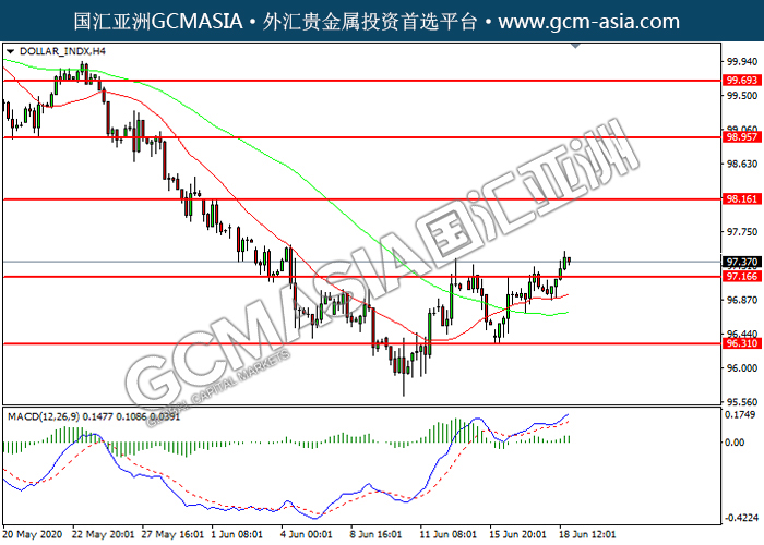 DOLLAR_INDX,H4:美指突破前期压力,震荡上行。MACD多头动能略增,短期可持续关注多头为主。上方关98.15压力和98.95压力,下方关注97.15支撑和96.30支撑。
