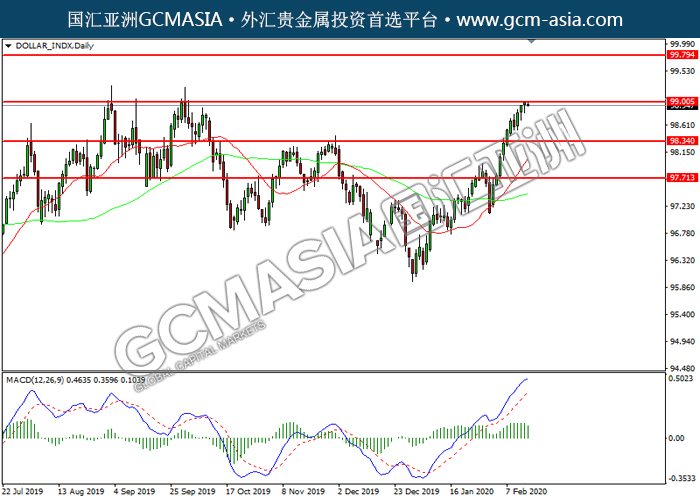 DOLLAR_INDX, Daily: 美指震荡上行,目前测试前期压力。然而,MACD多头动能有所略减,短期可关注技术性回调。上方关注99.00压力和99.80压力,下方关注98.35支撑和97.70支撑。