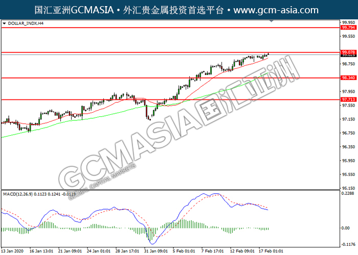 DOLLAR_INDX, H4: 美指震荡上行,目前测试前期压力。MACD 空头动能略减,若突破可关注多头为主。上方关注99.05压力和99.80压力,下方关注98.35支撑和97.70支撑。