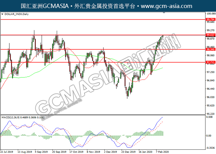 DOLLAR_INDX, Daily: 美指震荡上行,目前测试前期压力。然而,MACD多头动能有所略减,短期可关注技术性回调。上方关注99.05压力和99.80压力,下方关注98.35支撑和97.70支撑。