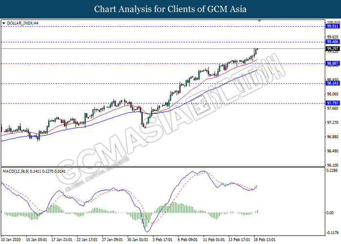 DOLLAR_INDX, H4: 美指多头排列,目前测试靠近前期要。,MACD形成金叉,动能略增,若突破继续看多为主。上方关注99.50压力和99.90压力,下方关注98.90支撑和98.35支撑。