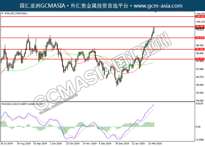 DOLLAR_INDX, Daily: 美指多头排列,目前测试前期压力。MACD 多头动能略增,若突破可关注多头为主。上方关注99.80压力和100.45压力,下方关注99.05支撑和98.35支撑。