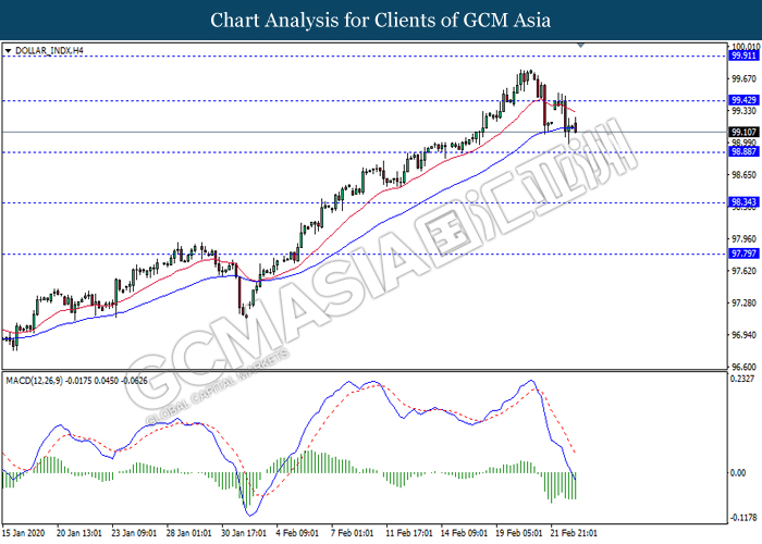 DOLLAR_INDX, H4: 美指高位承压回落。MACD动能略减,短期继续关注空头回调为主。上方关注99.40压力和99.90压力,下方关注98.90支撑和98.35支撑。