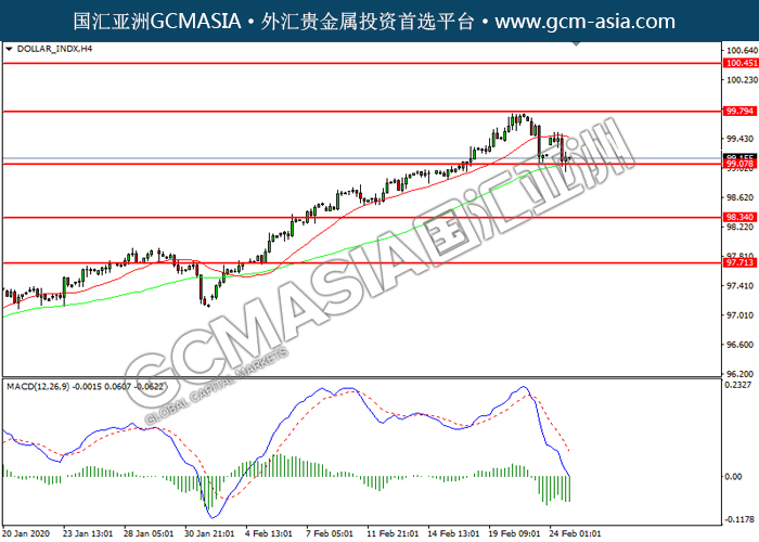 DOLLAR_INDX, H4: 美指高位回落,目前测试前期支撑。然而,MACD 空头动能略减,短期可关注技术性回调。上方关注99.80压力和100.45压力,下方关注99.05支撑和98.35支撑。