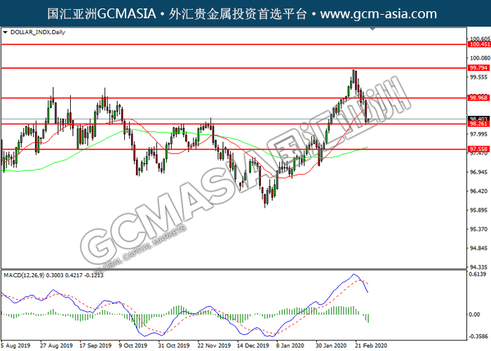 DOLLAR_INDX, Daily: 美指空头排列,目前测试前期支撑。MACD空头动能略增,若下破可关注空头为主。上方关注98.95压力和99.80压力,下方关注98.25支撑和97.55支撑。