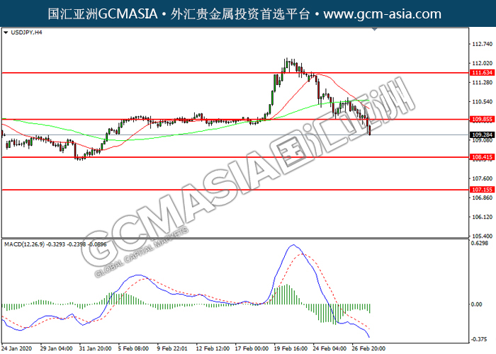 USDJPY, H4: 美日突破前期支撑,震荡下行。MACD空头动能略增,短期可持续关注空头为主。上方关注109.85压力和111.65压力,下方关注108.40支撑和107.15支撑。
